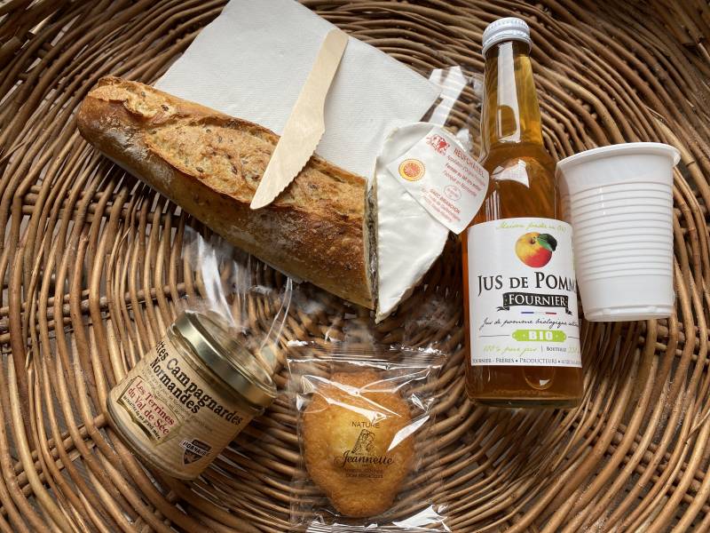 Vous pourrez emporter une terrine de charcuterie ou de poisson, un fromage , une boisson (jus de pomme ou cidre), en dessert nous proposons biscuits normands ou madeleine Jeannette. Tout cela sera accompagné d’une baguette tradition.